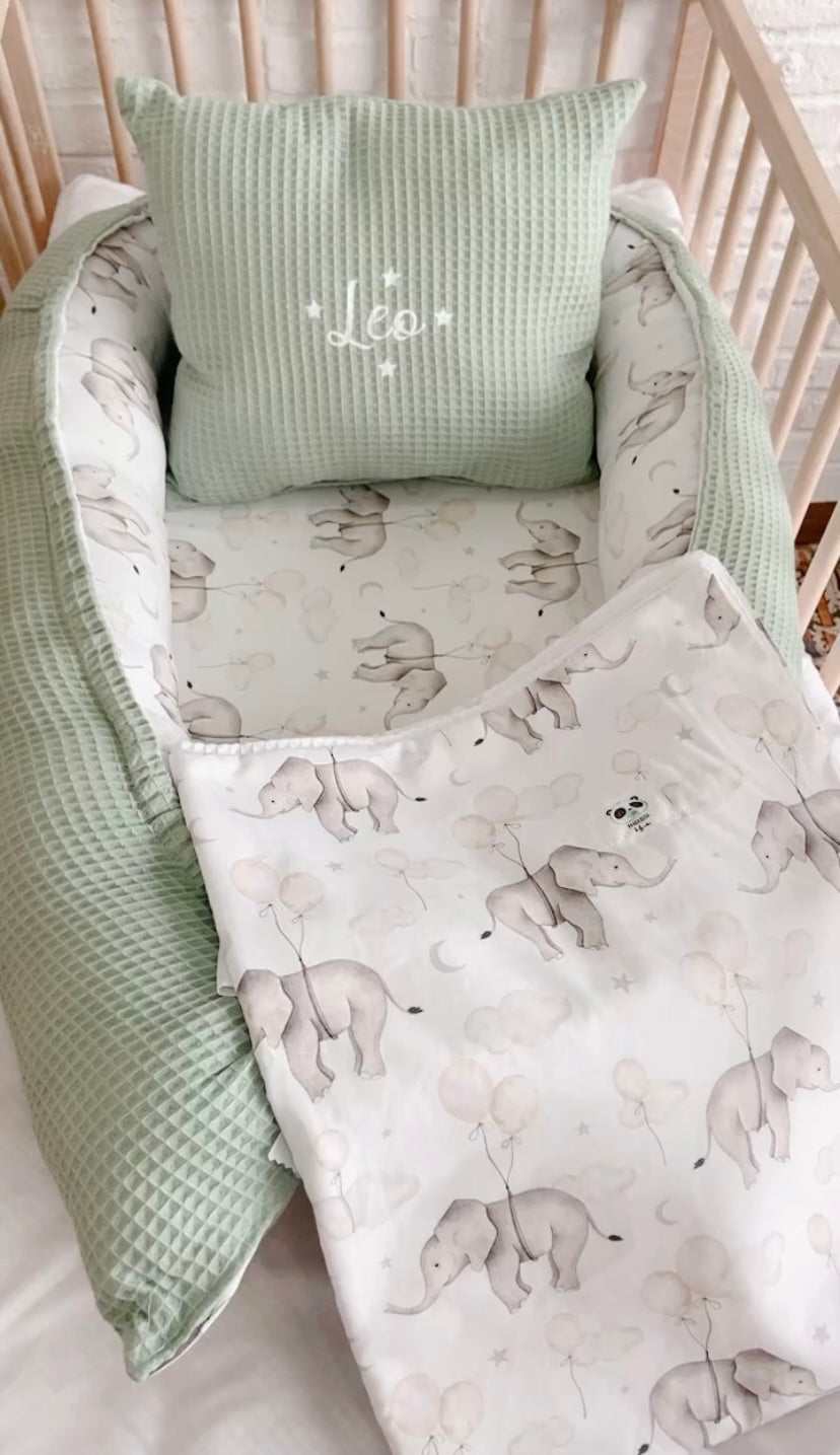 Pack Baby Elefantitos Verde (nido, manta y cojín personalizado) (copia)