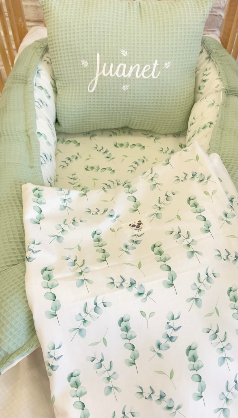 Pack Baby Eucalipto (nido, manta y cojín personalizado)