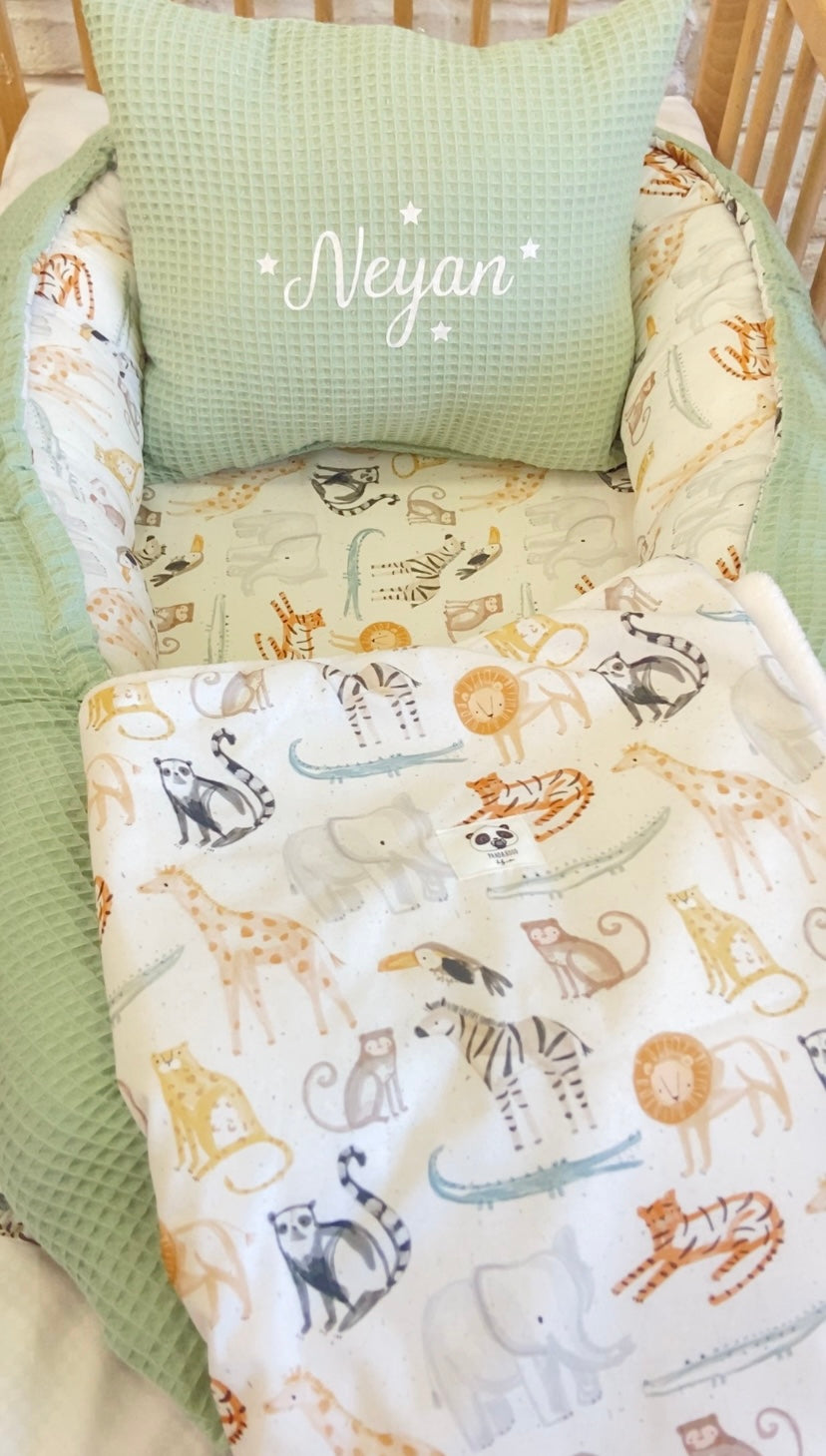 Pack Baby África waffle verde (nido, manta y cojín personalizado)