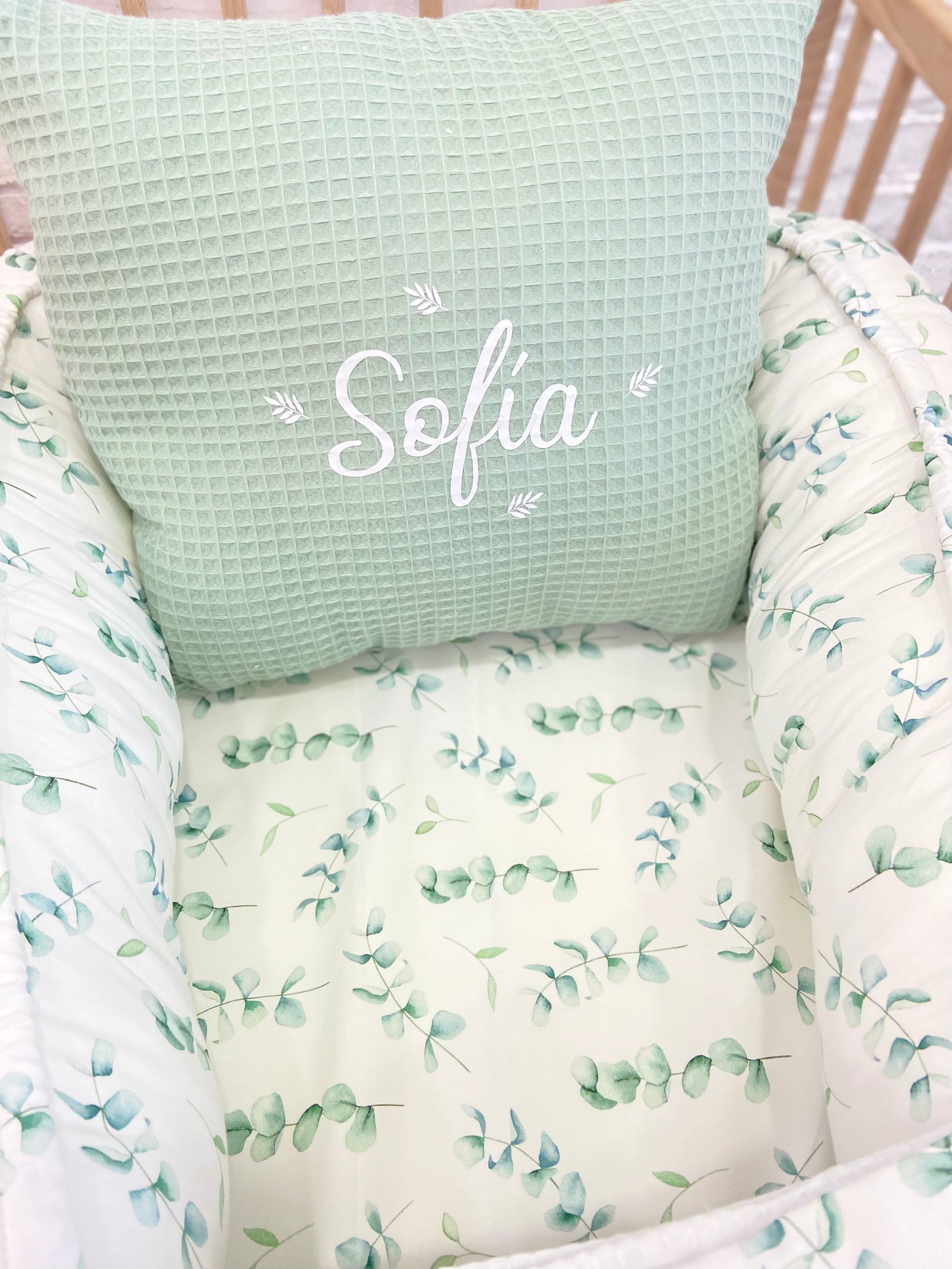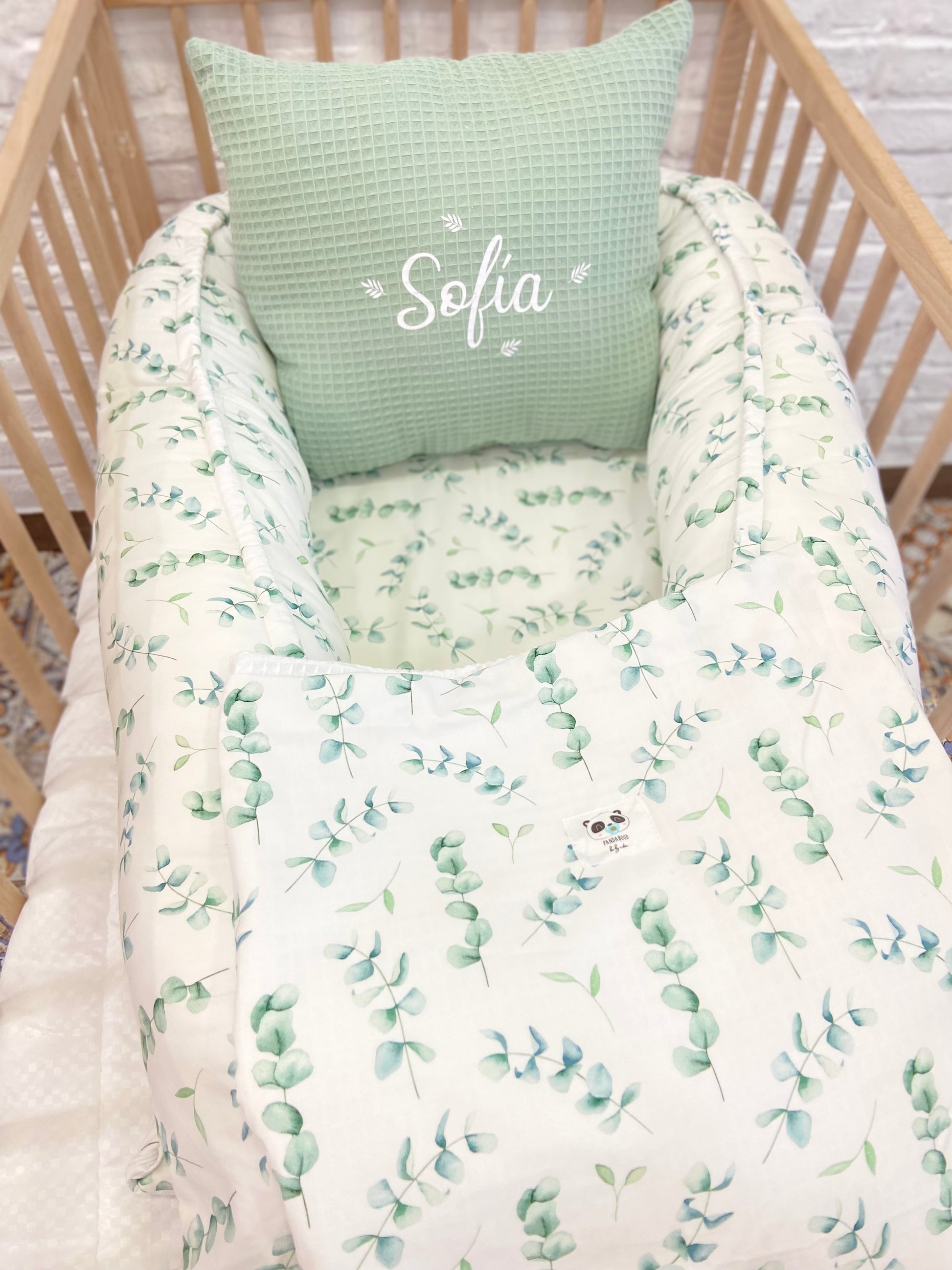 Pack Baby Eucalipto (nido, manta y cojín personalizado)