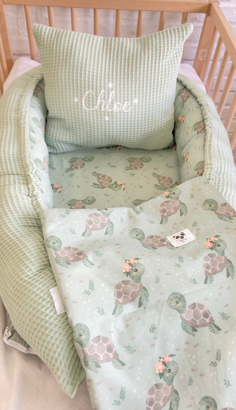 Pack Baby Tortuguitas Waffle (nido, manta y cojín personalizado)